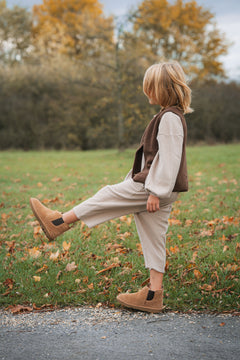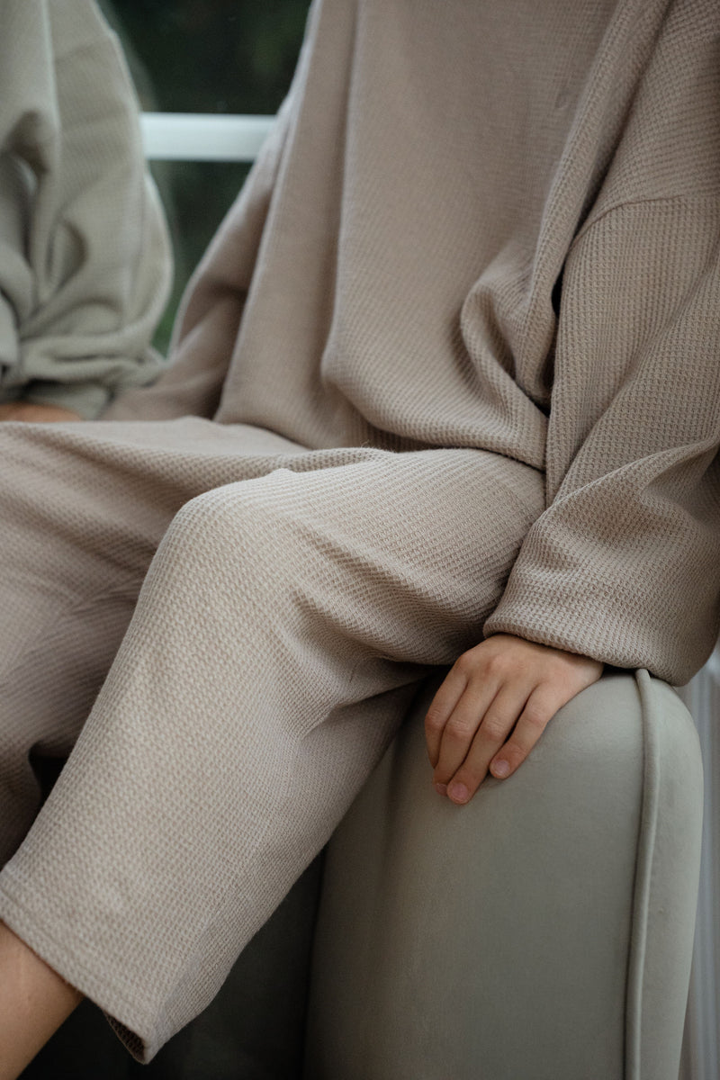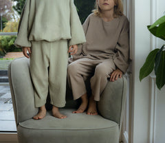 Locker, weich, alltagstauglich: Unsere Barrel-Leg Hose aus Waffelstrick sitzt bequem und macht jede Bewegung mit. Mit einem elastischen Bund ausgestattet, ohne zu kneifen, mit Taschen für kleine Schätze ausgestattet – perfekt für Kita & Zuhause. Besonders schön im monochromen Set mit unserem Waffelstrick Shirt oder wild kombiniert mit Merinowolle-Lieblingen.