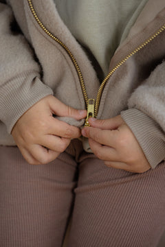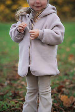 Unsere Jacke aus mulesing-freiem Merinowollfleece ist kuschelig weich, temperaturausgleichend und das ganze Jahr tragbar. Sie hält warm, ohne zu überhitzen – perfekt für Autofahrten. Der mitwachsende, etwas weitere Schnitt sorgt für langen Tragekomfort. Liebe zum Detail, zugleich stylisch durch goldene Reißverschlüsse und Kapuze. Die eingearbeitete dünne Baumwollschicht sorgt dafür, dass die Jacke strapazierfähiger ist.